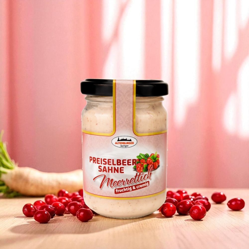80 % Sahne Meerrettich (Meerrettich gerieben, Rapsöl, 25 % Sahne, Branntweinessig, Zucker, Molkenerzeugnis, Verdickungmittel: Guarkernmehl, Xanthan, jodiertes Speisesalz (Speisesalz, Kaliumjodat), Säuerungmittel: Citronensäure, Aroma, Antioxydationsmittel: Ascorbinsäure, Natriummetabisulfit), 20 % Preiselbeerzubereitung (Preiselbeeren, Zucker, Invertzuckersirup)