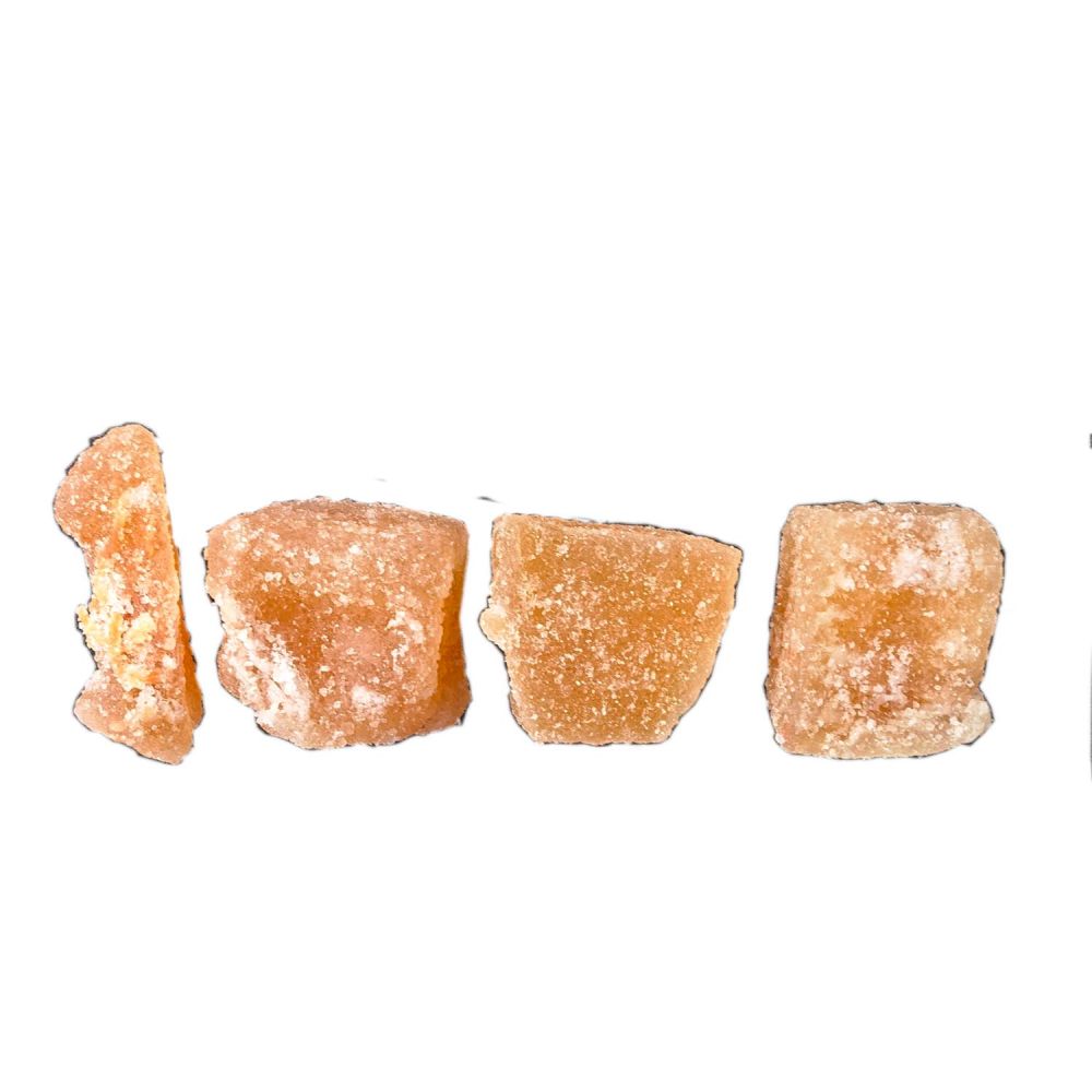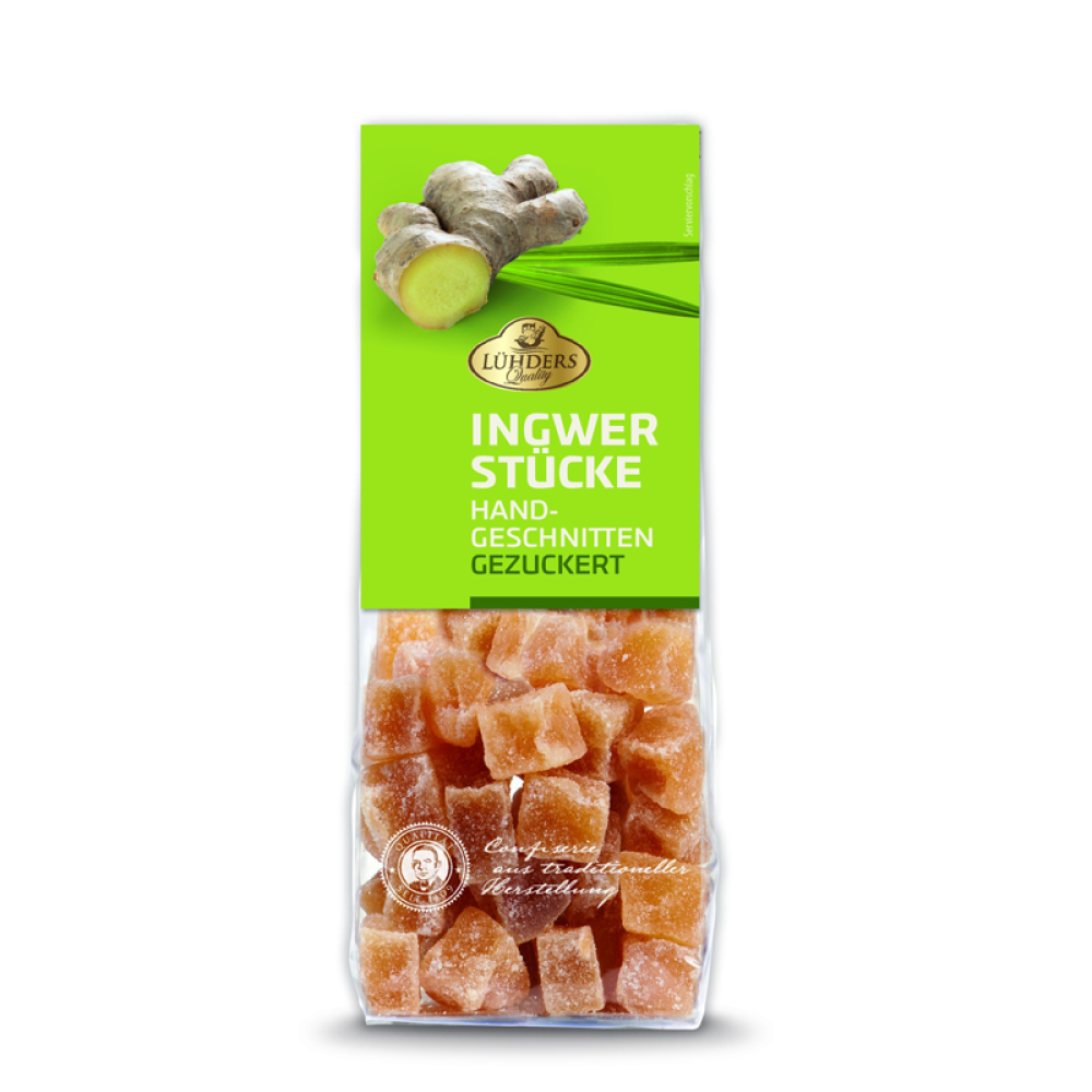 Gezuckerte Ingwerwürfel mit der typischen, mild-süßen Schärfe.